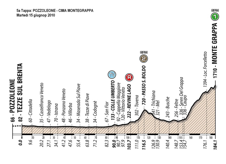 Oggi, martedì 15 giugno 2010, è in programma il tappone dellla corsa. La quinta tappa, dedicata ad Ottavio Bottecchia, prenderà il via da Pozzoleone e dirigerà verso Colle Umberto dove sarà posto il traguardo volante. I corridori affronteranno poi la scalata a Passo San Boldo, gran premio della montagna di seconda categoria. Ma la vera selezione ci sarà sulle rampe del temibile Montegrappa, che verrà affrontato dopo 160 chilometri dalla partenza.